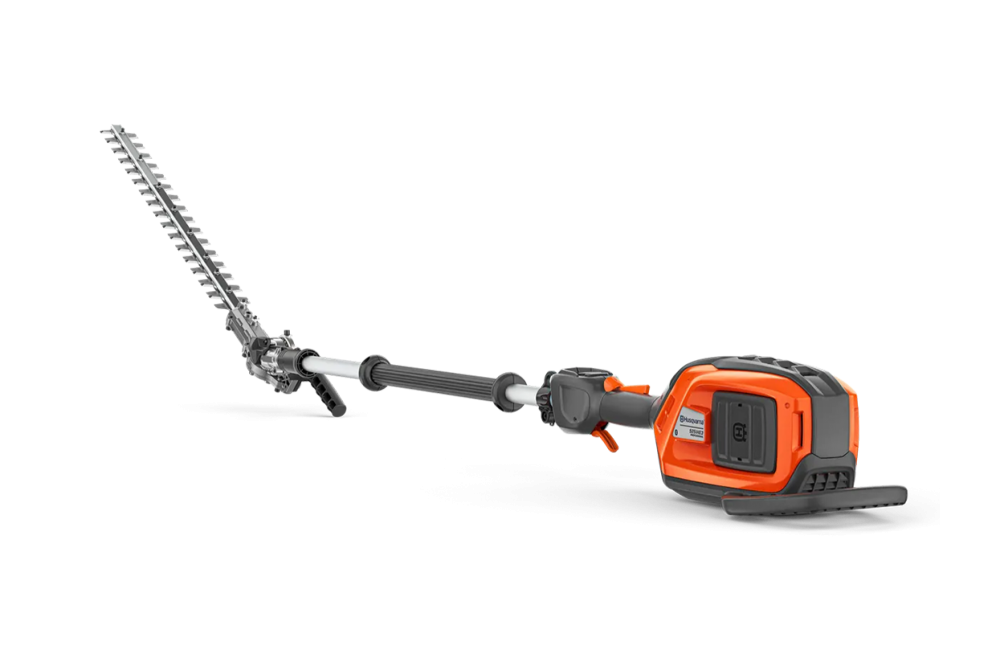 Battery-powered pole hedge trimmer with 3m reach and adjustable cutter bar