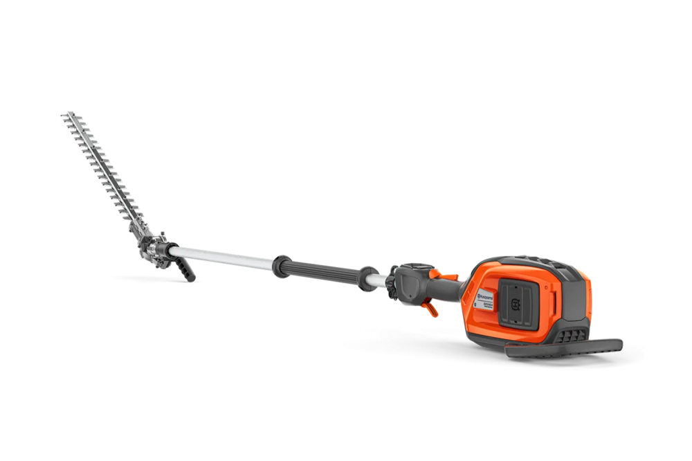 Battery-powered pole hedge trimmer with 4m reach and adjustable cutter bar